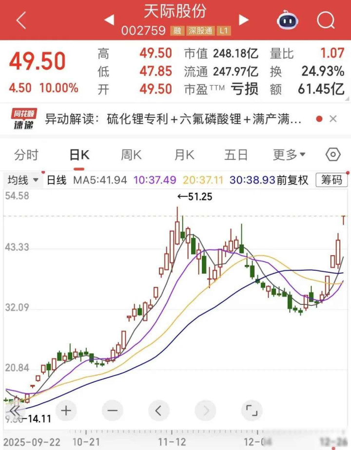 最近锂电池股票表现得很活跃,天际股份在四天里收获三个涨停板,这家公司主要生产六氟磷酸锂,产能位居全国前三,海科新源和永太科技也跟着上涨,不过别急着高兴,还有四十八家公司今年以来股价依然下跌,部分跌幅超过百分之四十,这说明市场还没有完全反应过来,一些公司可能被低估了。