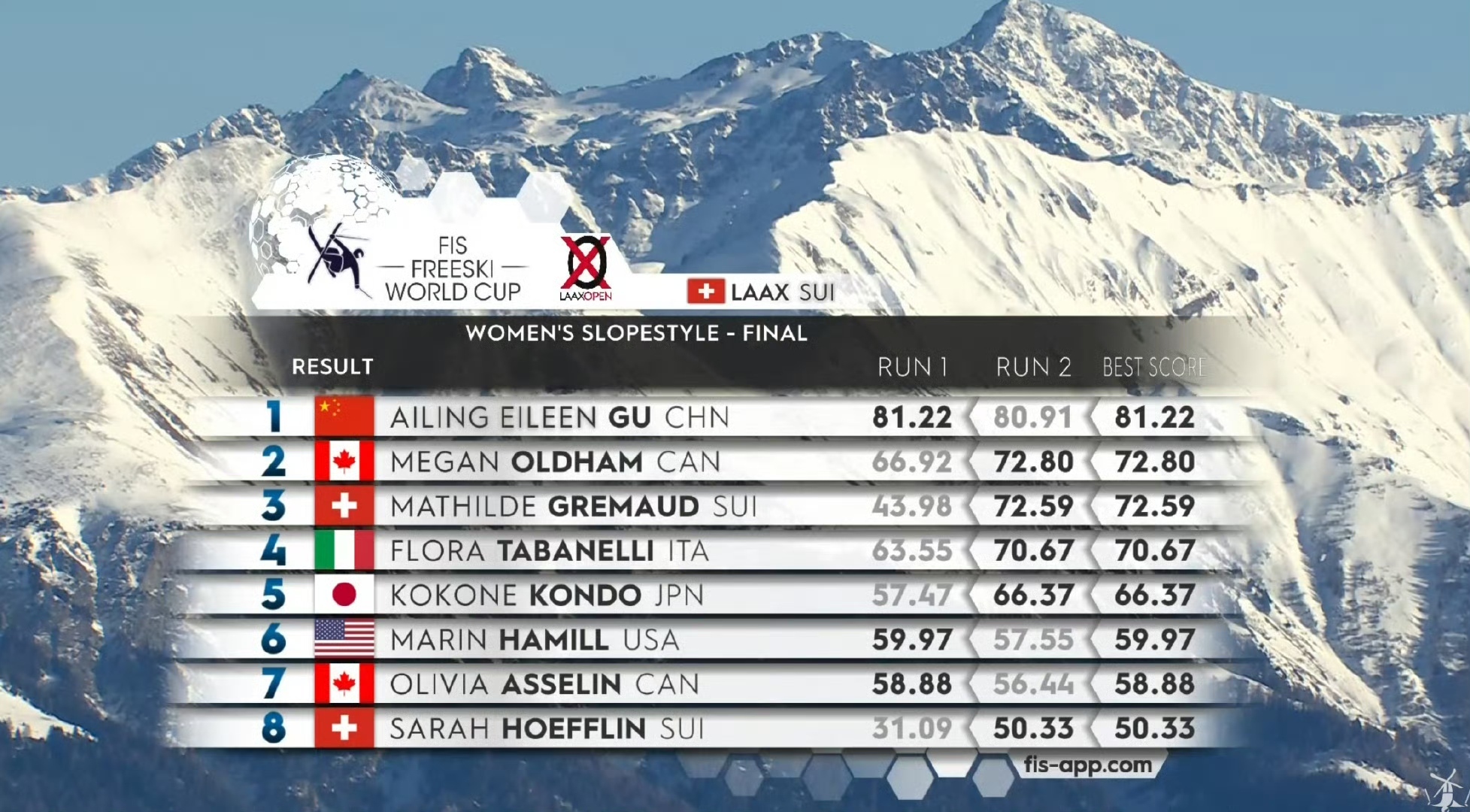 1月14日进行的资格赛中,谷爱凌以78.20分位列所有参赛选手首位晋级决赛。17日的决赛中,谷爱凌的两次滑行均堪称完美,分别获得81.22分和80.91分,以领先第二名近10分的优势夺得冠军。